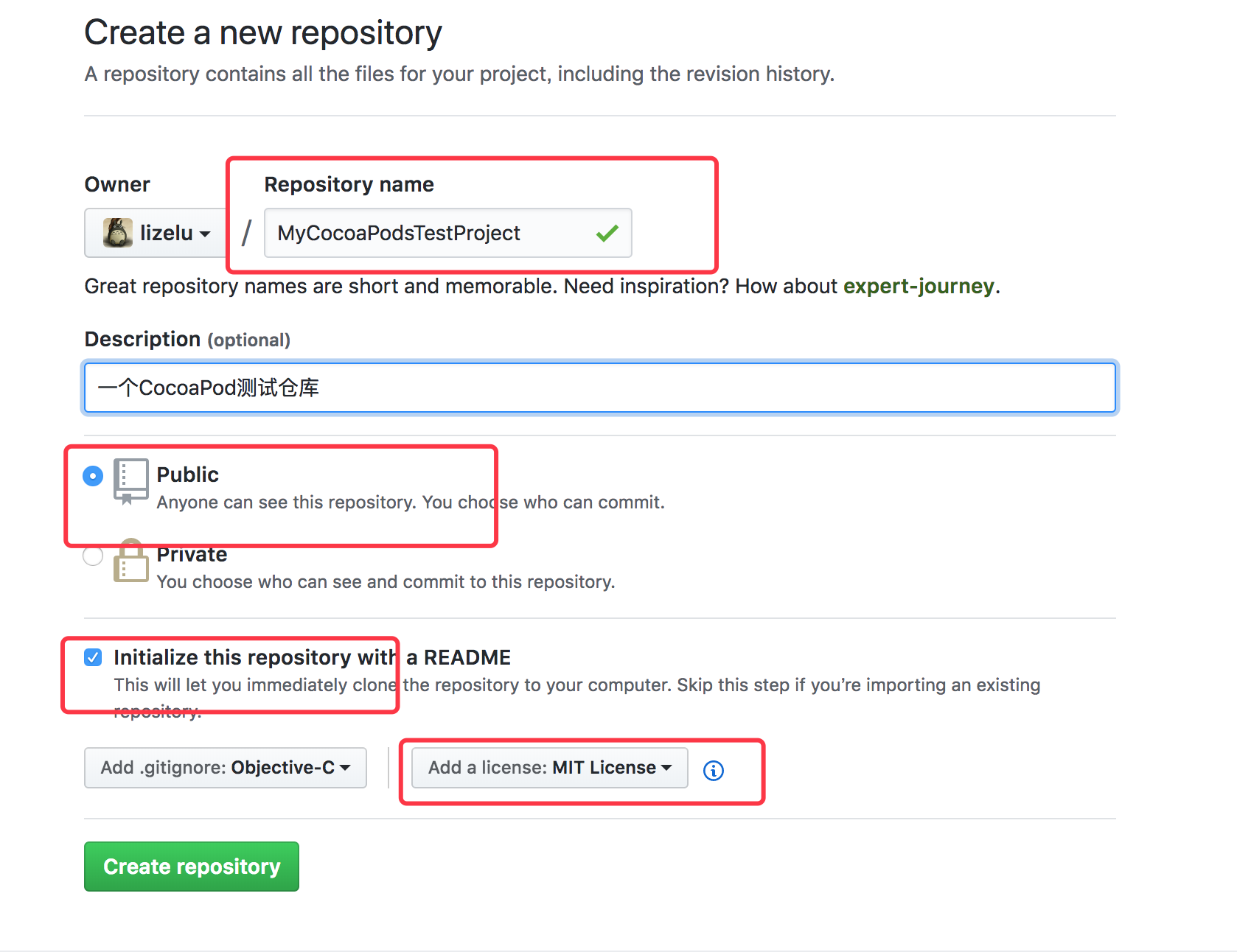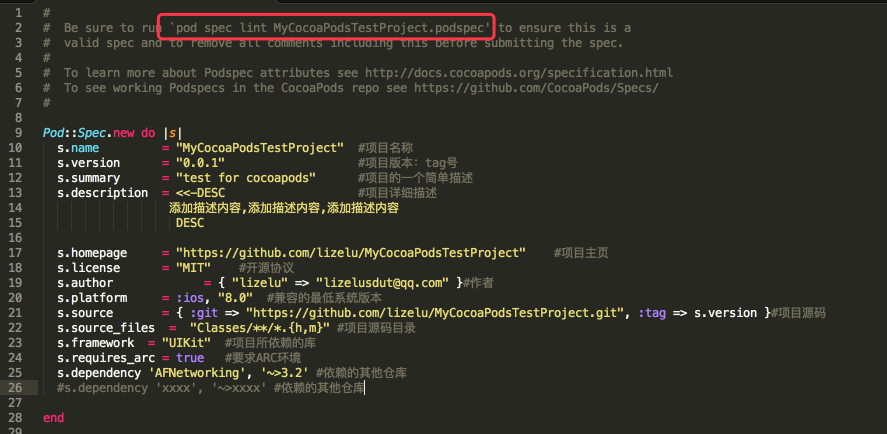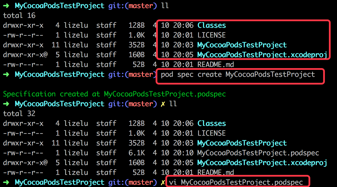 言归正传,在Github上创建好相关的工程并选好相关的开源协议后,将工程Clone到本地,添加上自己要开源的代码,然后在该工程中创建podspec文件。可以通过 pod spec create 命令来创建相关的podsepc文件。