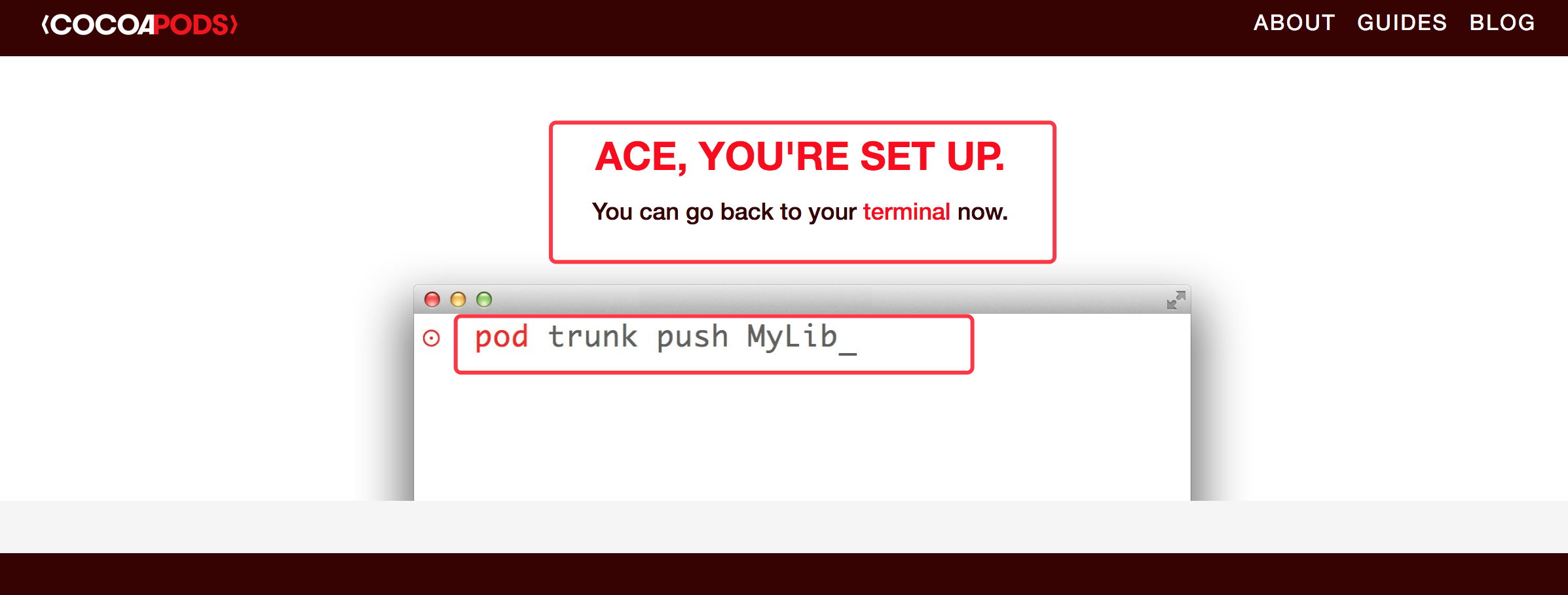 Git仓库配置已经账号注册完毕后,接下来就开始往CocoaPods上发布自己的仓库了。我们可以通过 pod trunk push xxxxx.podspce 将podspec文件发布到CocoaPods的Spec仓库中。完成这一操作,就完成的我们仓库的发布了。
