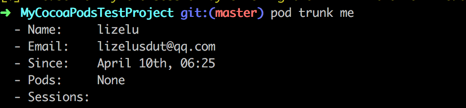 往CocoaPods上集成开源库,需要相关的CocoaPods账号。我们可以通过 pod trunk me来查看账号是否存在。如果不存在会提示你进行注册并且进行相关认证。下方就使用了一个为注册过的账号进行 trunk。然后进行了相关账号的注册和激活