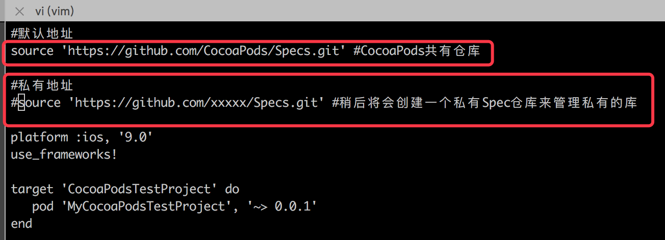在Podfile中可以指定多个 Specs 仓库的地址,稍后我们会创建我们自己的Specs仓库,然后在该Specs仓库中上次发布我们自己使用的依赖库。