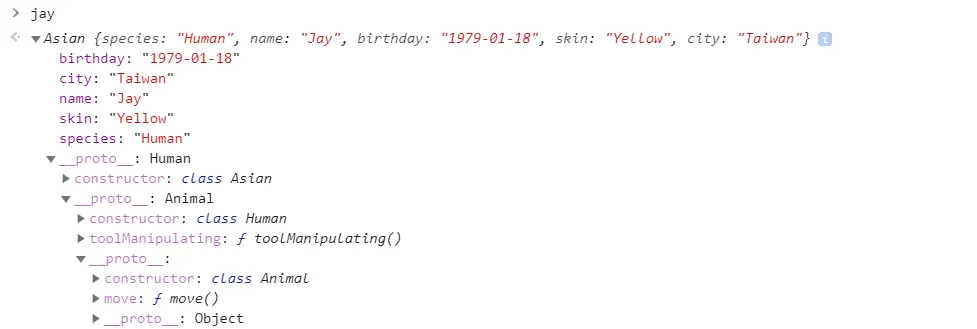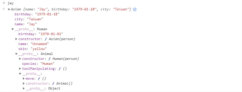 var jay = new Asian({ name: 'Jay', birthday: '1979-01-18', city: 'Taiwan' })
