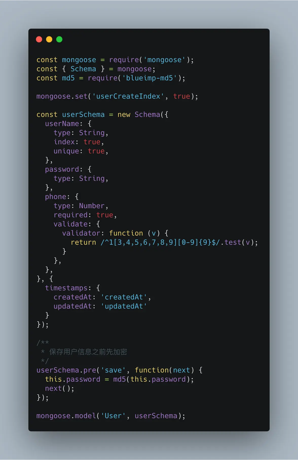 创建用户表,保存用户信息之前需要对用户密码进行加密,我这边使用的是md5加密,在userSchema保存之前调用加密userSchema.pre('save')第二个函数不能用箭头函数,否则this.password取不到