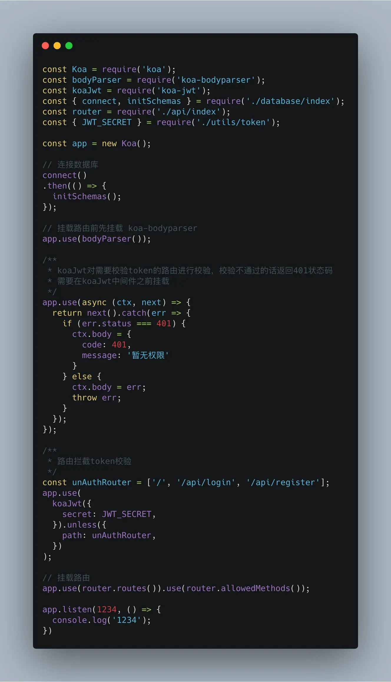 在app.js引入我们的路由以及数据库,需要对一些路由进行token拦截,我们这边把不需要token校验的路由写在一个数组里面