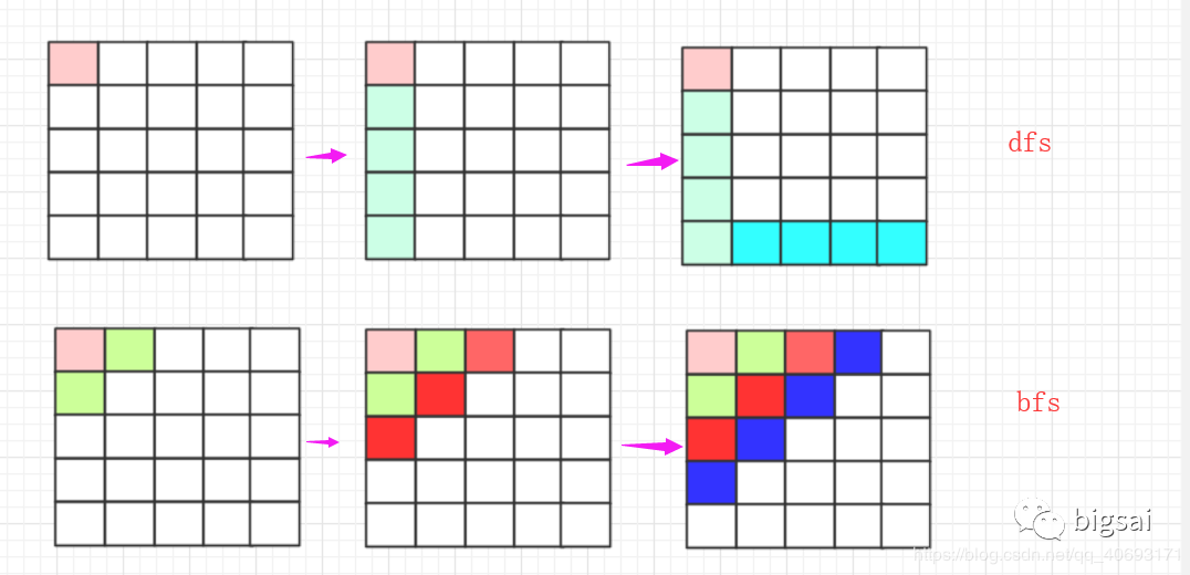如果从路径上走来看,dfs就是一条跑的很快的疯狗,到处乱咬。没路了就转头,再没路了再跑回来去其他地方,而bfs就像是一团毒气,慢慢延申!
