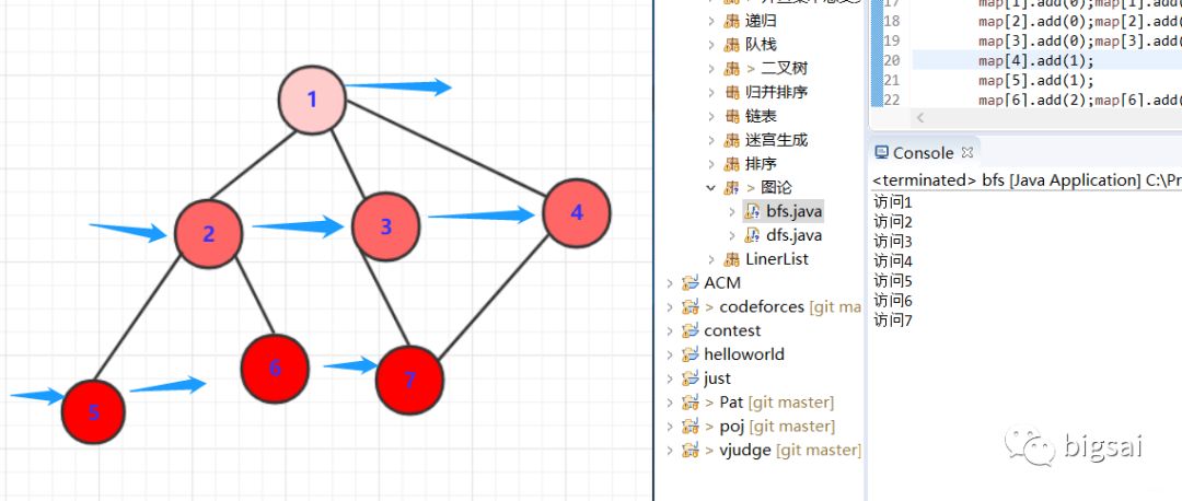 import java.util.ArrayDeque;import java.util.ArrayList;import java.util.List;import java.util.Queue;public class bfs {public static void main(String[] args) { List<Integer> map[]=new ArrayList[7];boolean isVisit[]=new boolean[7];for(int i=0;i<map.length;i++)//初始化{ map[i]=new ArrayList<Integer>();} map[0].add(1);map[0].add(2);map[0].add(3); map[1].add(0);map[1].add(4);map[1].add(5); map[2].add(0);map[2].add(6); map[3].add(0);map[3].add(6); map[4].add(1); map[5].add(1); map[6].add(2);map[6].add(3); Queue<Integer>q1=new ArrayDeque<Integer>(); q1.add(0);isVisit[0]=true;while (!q1.isEmpty()) {int va=q1.poll(); System.out.println("访问"+(va+1));for(int i=0;i<map[va].size();i++){int index=map[va].get(i);if(!isVisit[index]){ q1.add(index); isVisit[index]=true;}}}}}