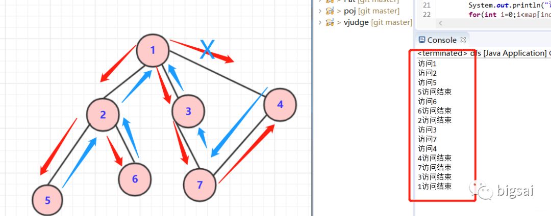 package 图论;public class dfs {static boolean isVisit[];public static void main(String[] args) {int map[][]=new int[7][7]; isVisit=new boolean[7]; map[0][1]=map[1][0]=1; map[0][2]=map[2][0]=1; map[0][3]=map[3][0]=1; map[1][4]=map[4][1]=1; map[1][5]=map[5][1]=1; map[2][6]=map[6][2]=1; map[3][6]=map[6][3]=1; isVisit[0]=true;dfs(0,map);//从0开始遍历}private static void dfs(int index,int map[][]) {// TODO Auto-generated method stub System.out.println("访问"+(index+1)+" ");for(int i=0;i<map[index].length;i++)//查找联通节点{if(map[index][i]>0&&isVisit[i]==false){ isVisit[i]=true;dfs(i,map);}} System.out.println((index+1)+"访问结束 ");}}
