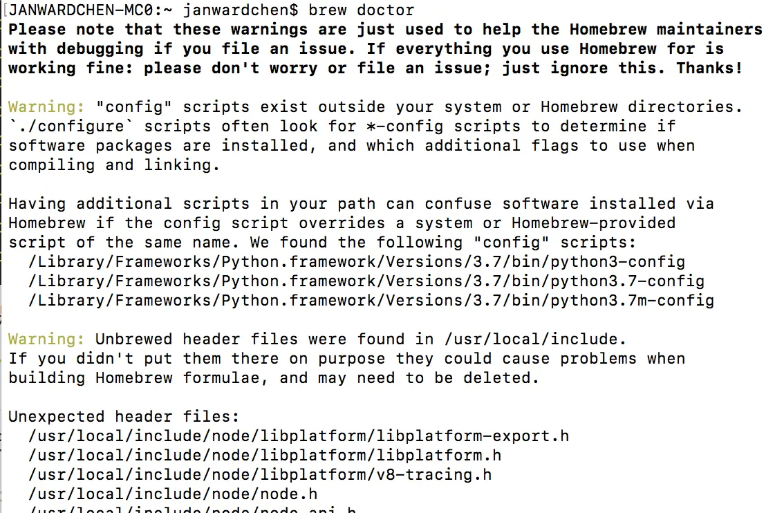 执行命令brew doctor查看输出内容,检查输出内容中没是否存在warning或error,若存在,则一一对应解决,否则可进行下一步