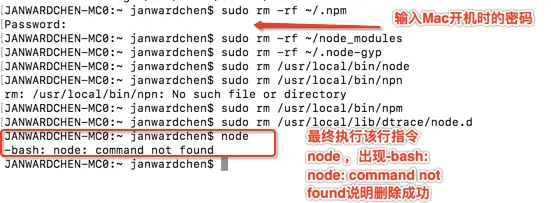 最后执行指令node,若出现command not found提示,则说明node已删除