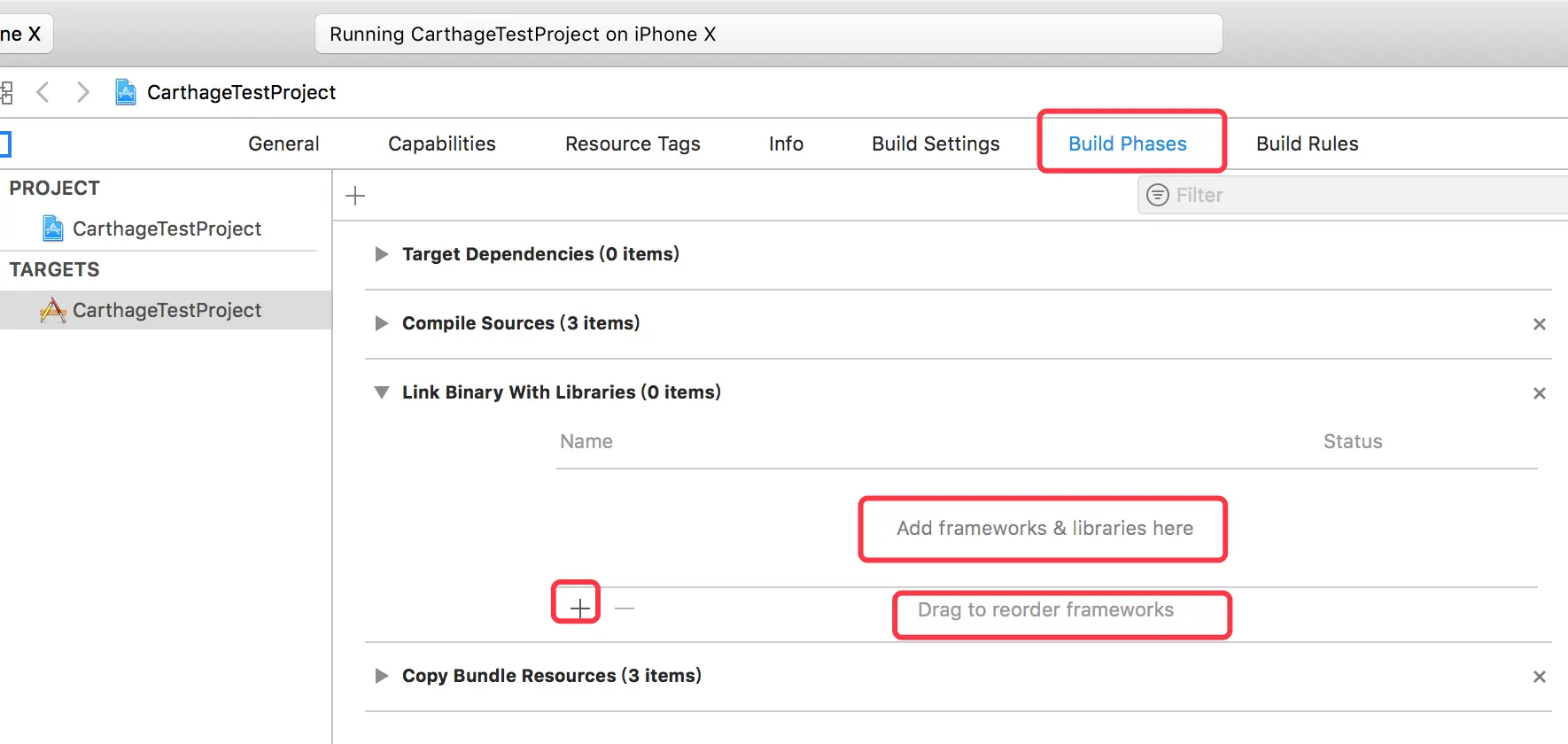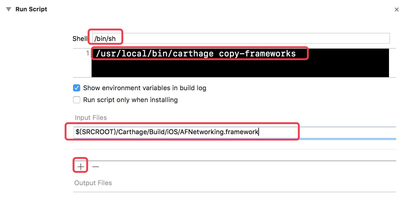 接下来要做的就是把Carthage生成的相应依赖库的framework引入到我们的工程中。首先找到我们工程对应的Targets, 然后找到Build Phases下方的 ➕号下方的New Run Script Phase, 来添加引入framework的相关脚本。