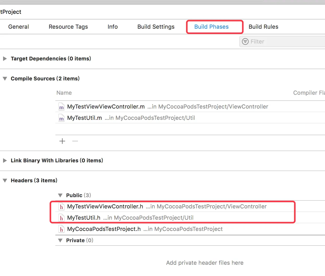 在引入相关的源文件后,在Build Phasea中的Header中的Public中添加对外暴露的头文件,如下所示:
