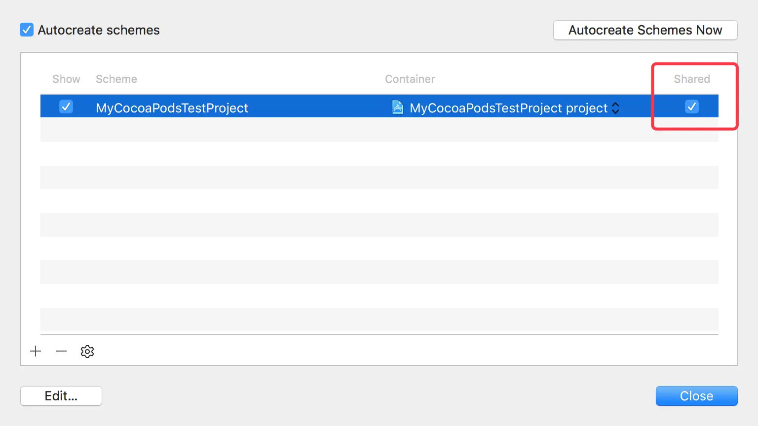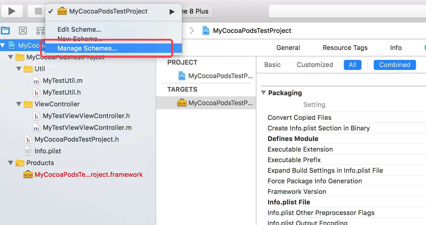 从上面Carthage update时提示的错误我们不难发现要想支持Carthage, 我们的git仓库中必须有一个可以生成framework的Project,并且该Project开启了Scheme的分享功能。接下来我们就让上述的 MyCocoaPodsTestProject工程支持Carthage的update。