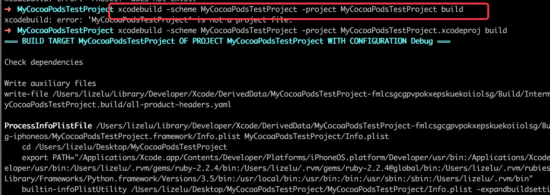 在执行上述命令时我们看到,对于“MyCocoaPodsTestProject”这个依赖仓库提示“该仓库没有被分享的framework schemes”, 稍后我们将会对“MyCocoaPodsTestProject”这个仓库添加shared framerwork schemes。