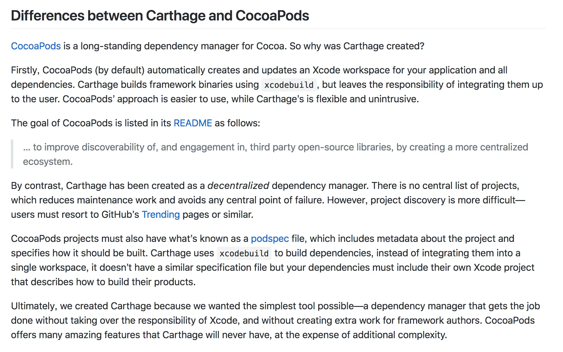 CocoaPods是一个长期在Cocoa项目中使用的包管理工具,但为什么还要去创建一个Carthage呢?