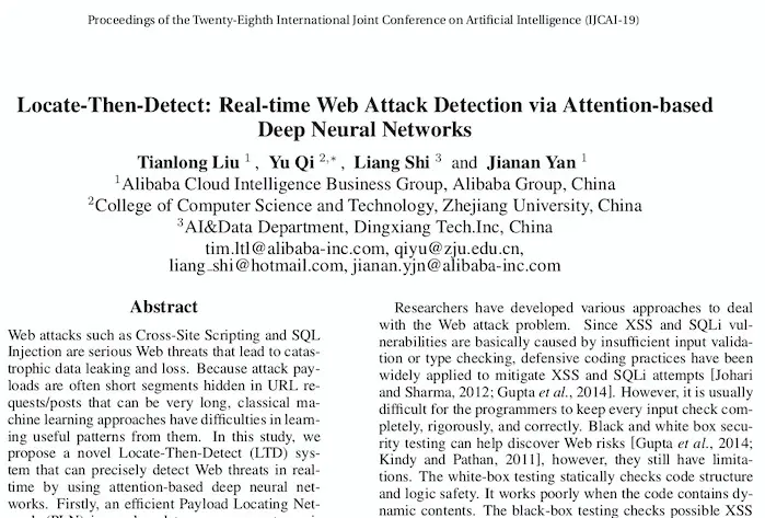 自1969年首次在华盛顿特区举办以来,IJCAI已成为人工智能领域最重要的顶级学术会议之一。每年被IJCAI成功收录的论文均是AI领域最前沿的研究成果。今年IJCAI主论坛的论文收录率仅为17.9%,比去年收录率更低。阿里云被主论坛收录的论文《Locate Then Detect:Web Attack Detection via Attention-based Deep Neural Networks》,首次解决了深度学习在Web攻击检测领域的结果可解释性问题,具有前所未有的创新意义,证明阿里云在安全AI技术的学术研究和应用方面业界领先。