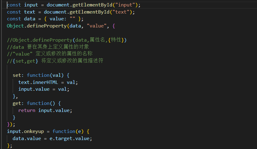 - 通过这个ES5的方法就可以直接很简单粗暴的说明双向绑定的原理: