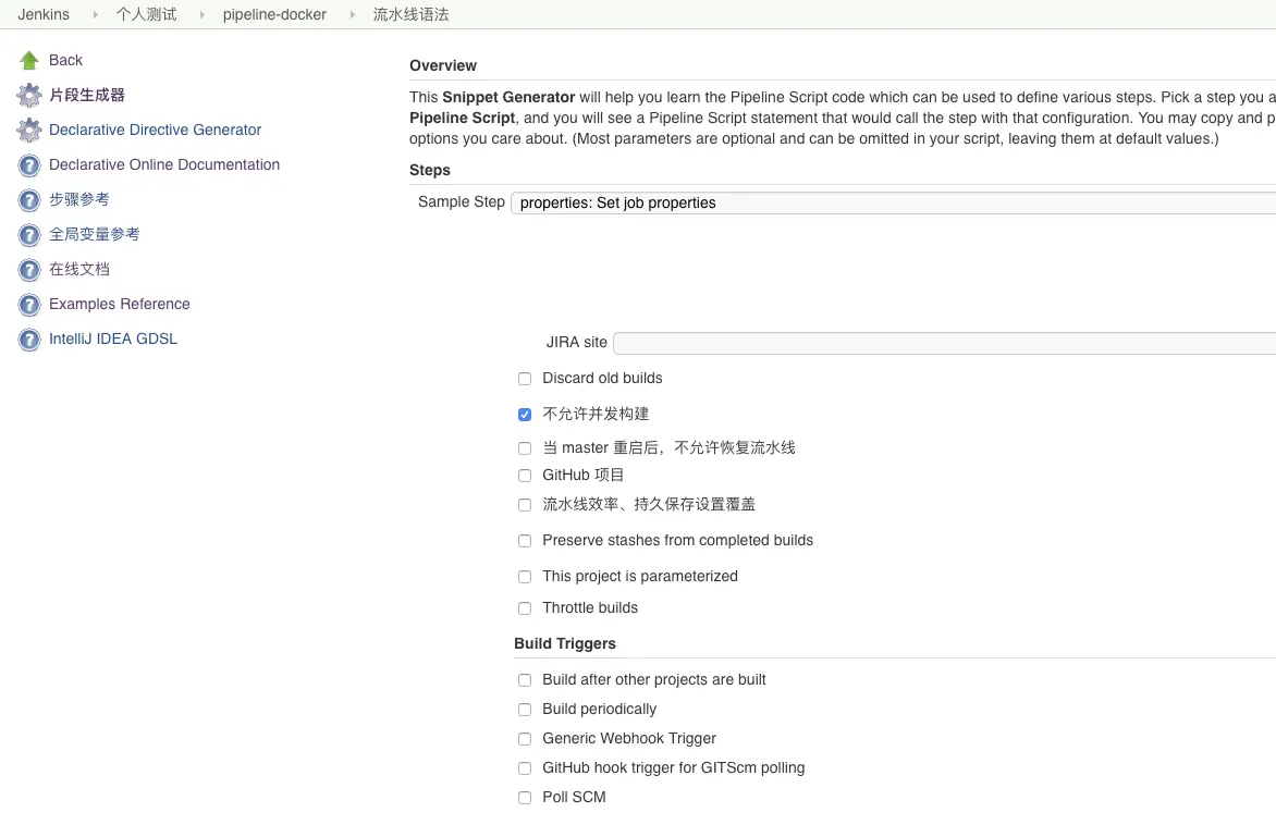 如果你现在还在使用freestyle类型的Jenkins项目,我建议你可以考虑转向pipeline类型,因为pipeline是趋势,那么有同学问了,我怎么快速的把freestyle中的配置转向pipeline。 今天我发现了一个好办法,就是使用 properties 打开Jenkins的片段生成器