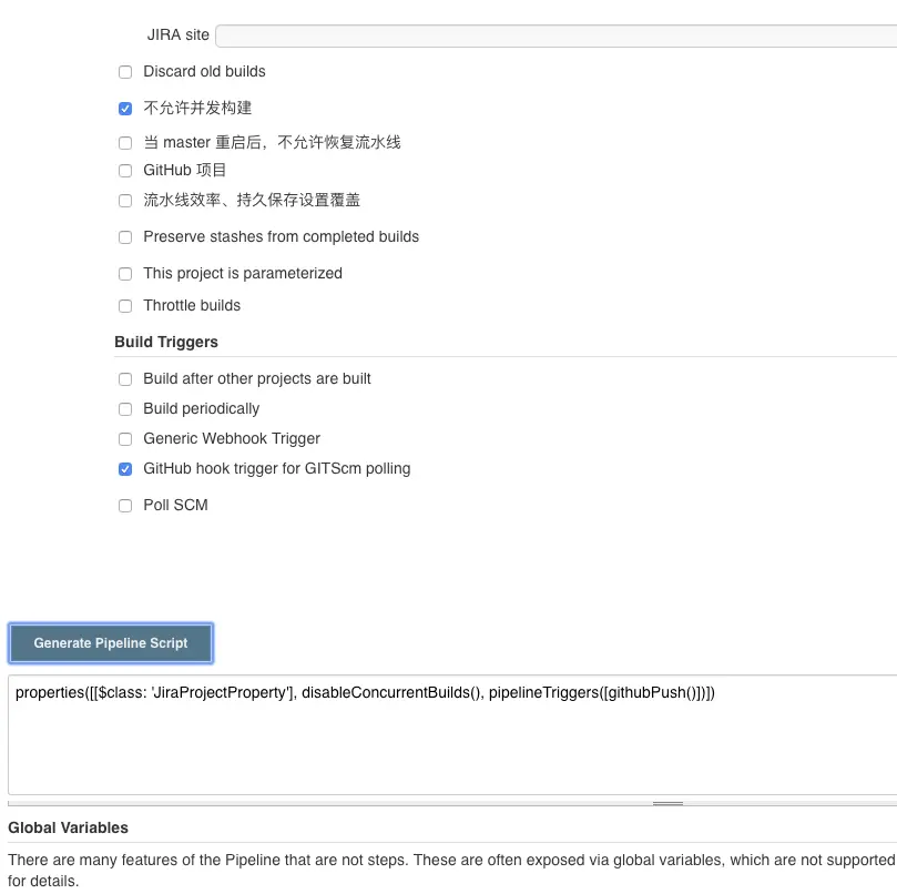 有非常多的配置项,配置之后点"Generate Pipeline Script",就会根据页面配置生成pipeline代码了。非常方便。