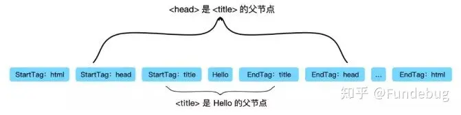 在上图中描述了节点之间的关系,例如: “Hello”Token位于“title”开始标签与“title”结束标签之间,表明“Hello”Token是“title”Token的子节点。同理“title”Token是“head”Token的子节点