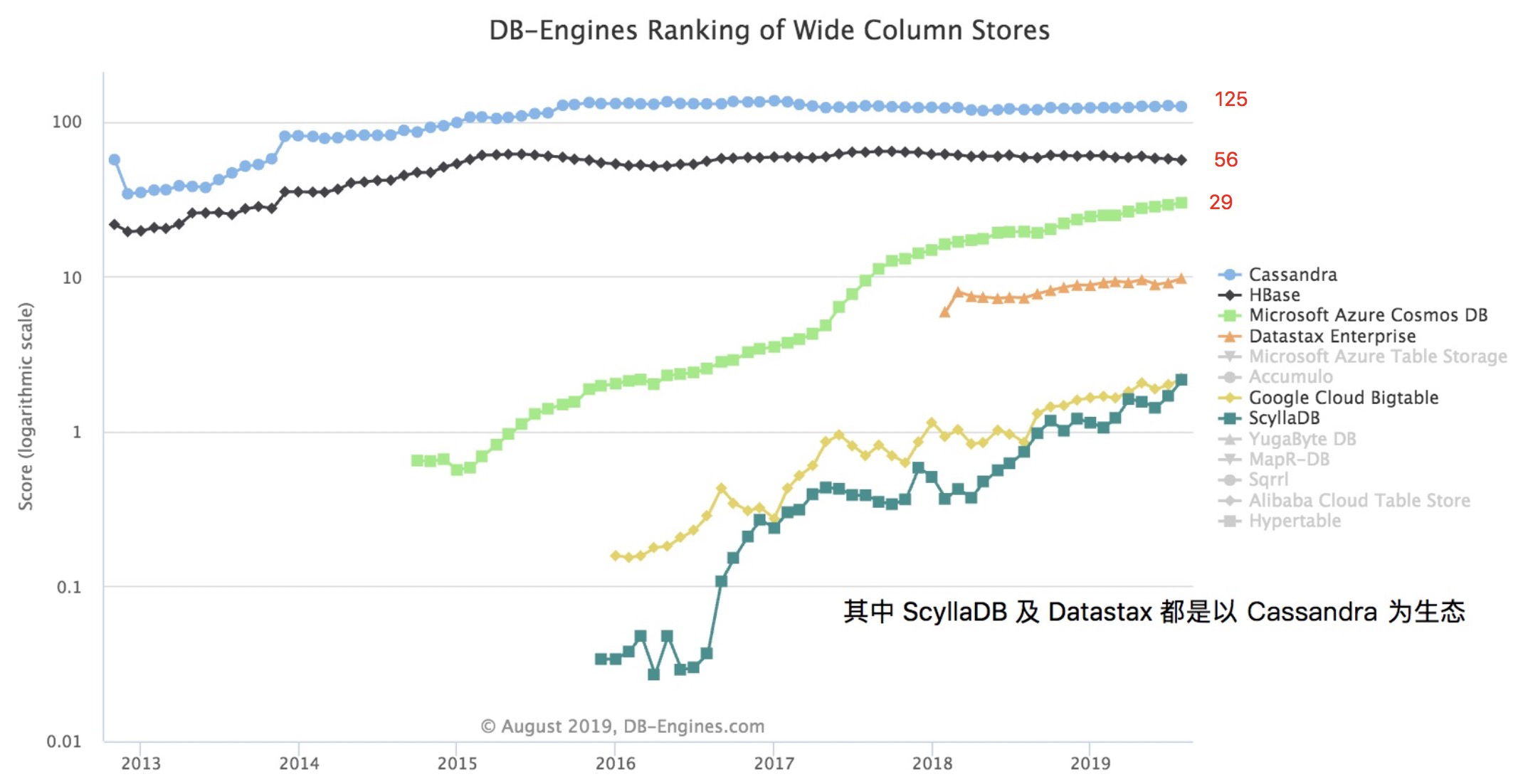 - 宽表市场排名: 排名第一。且 Datastax、ScyllaDB、CosmosDB都兼容CQL,已成事实标准: