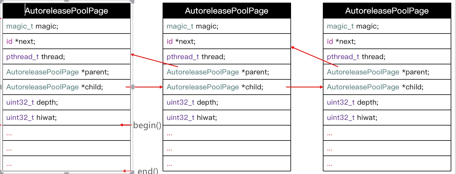 begin指向的是开始存放autorelease对象的地方, end指向结尾的位置