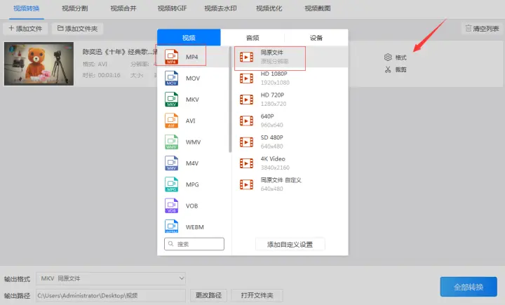 2、点击输出格式按钮选择视频输出的视频格式和视频分辨率。先把输出的视频格式设置为需要转换的mp4格式,然后把视频分辨率保持为和avi相同分辨率的同原文件格式。