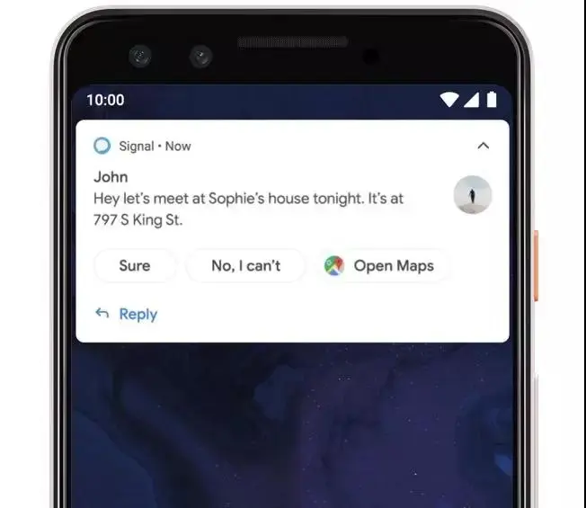 通知中的智能回复: Android 10 利用设备内置机器学习技术,在通知中显示与当下场景相关的建议操作,例如消息智能回复,或者当通知中包含地址信息时,建议用户开启地图应用。我们在开发这项功能时也考虑到了用户隐私问题,因此所有的机器学习任务完全在设备本地执行。不如立即上手一试,为应用添加由系统生成的回复和操作;当然,如果您想自行为应用设计通知内容,亦可选择停用该功能。