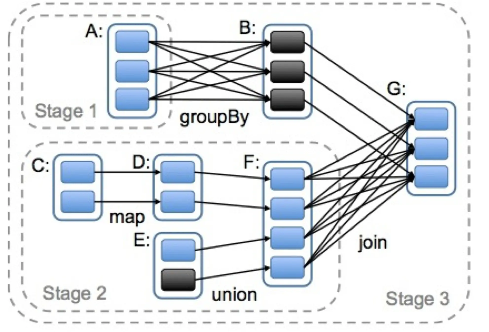 接着,划分窄依赖(别的分区没跑完,可以执行下一步)和宽依赖(别的分区没跑完,不可以执行下一步)的原因显而易见。我们可以把窄依赖的步骤划分到一起,它可以一路执行,不需要等待,直到宽依赖步骤卡住(必须等其它分区执行完)。这个从窄依赖一路执行到宽依赖的过程,可以在逻辑上划分成一个stage。这也就是常说的宽依赖是划分Stage的依据。