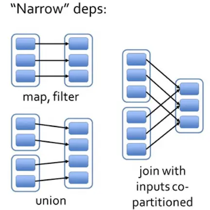 - 每一个父RDD的Partition最多被子RDD的一个Partition使用