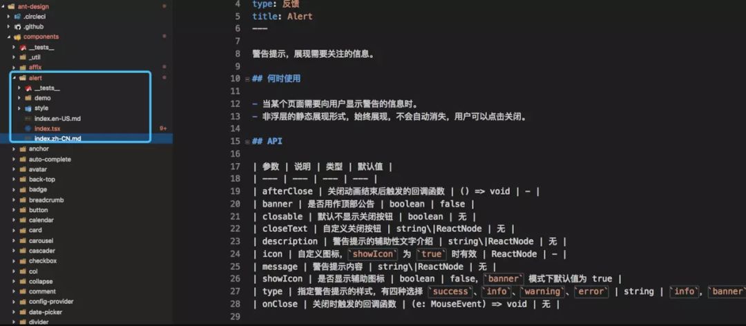 当然也有把对应的文档直接放到对应的代码目录下的,比如 ant-design 如下图: