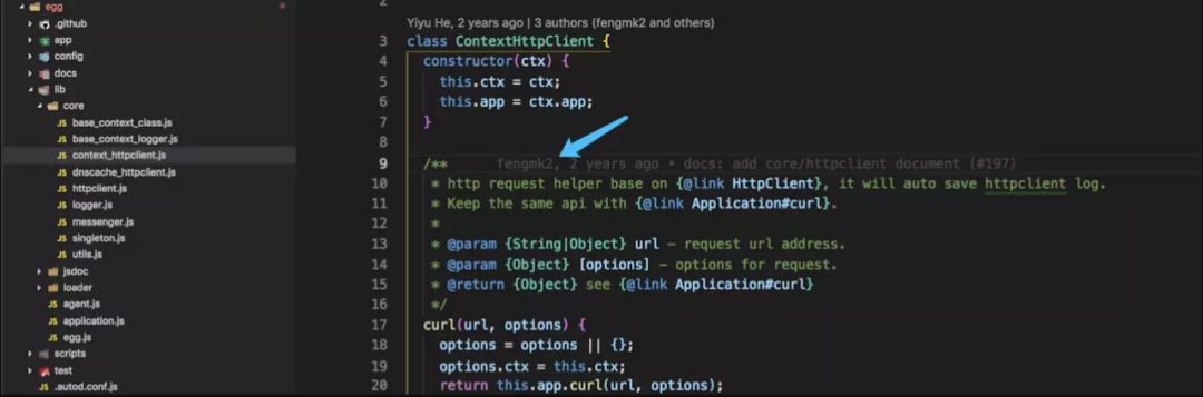 看上面两张图的箭头,指向的都是同一个作者 [fengmk2] 。他的函数注释规则,第一张图没有空格,第二种有空格,还有对返回的 this 的注释,比如很多人习惯将 this 直接注释成 Object 类型。