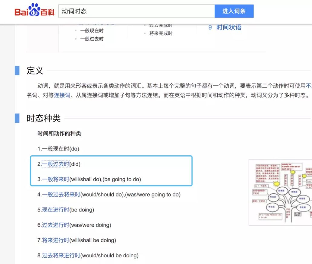注意上图中的 did 代表一般过去时,will 代表一般将来时。