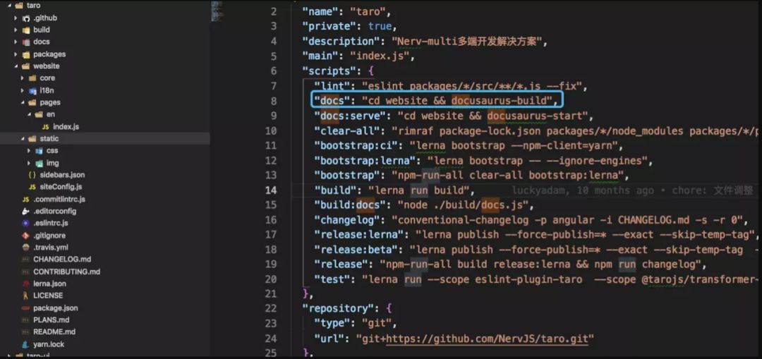 这里就是生成一个静态网站的秘密,执行 npm run docs 就可以。用的是 docusaurus 包。