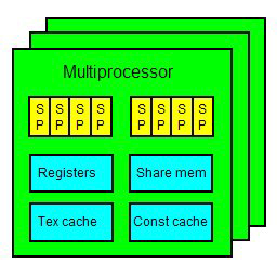 计算单元中有多个SM(streaming multiprocessors),每个SM上都有寄存器、内存和执行任务的SP(streaming processor/cuda core),运行时一个SP执行一个thread。