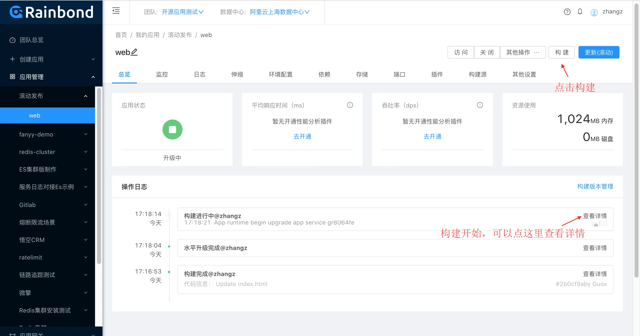 **无状态应用:**滚动更新时,首先会生成新的实例,新的实例启动后在后台运行,平台会使用健康监测机制去监听端口,判断新实例内应用是否运行正常,一旦监听到应用运行正常,就会上线新的应用,销毁旧的应用,以此完成滚动发布的流程。