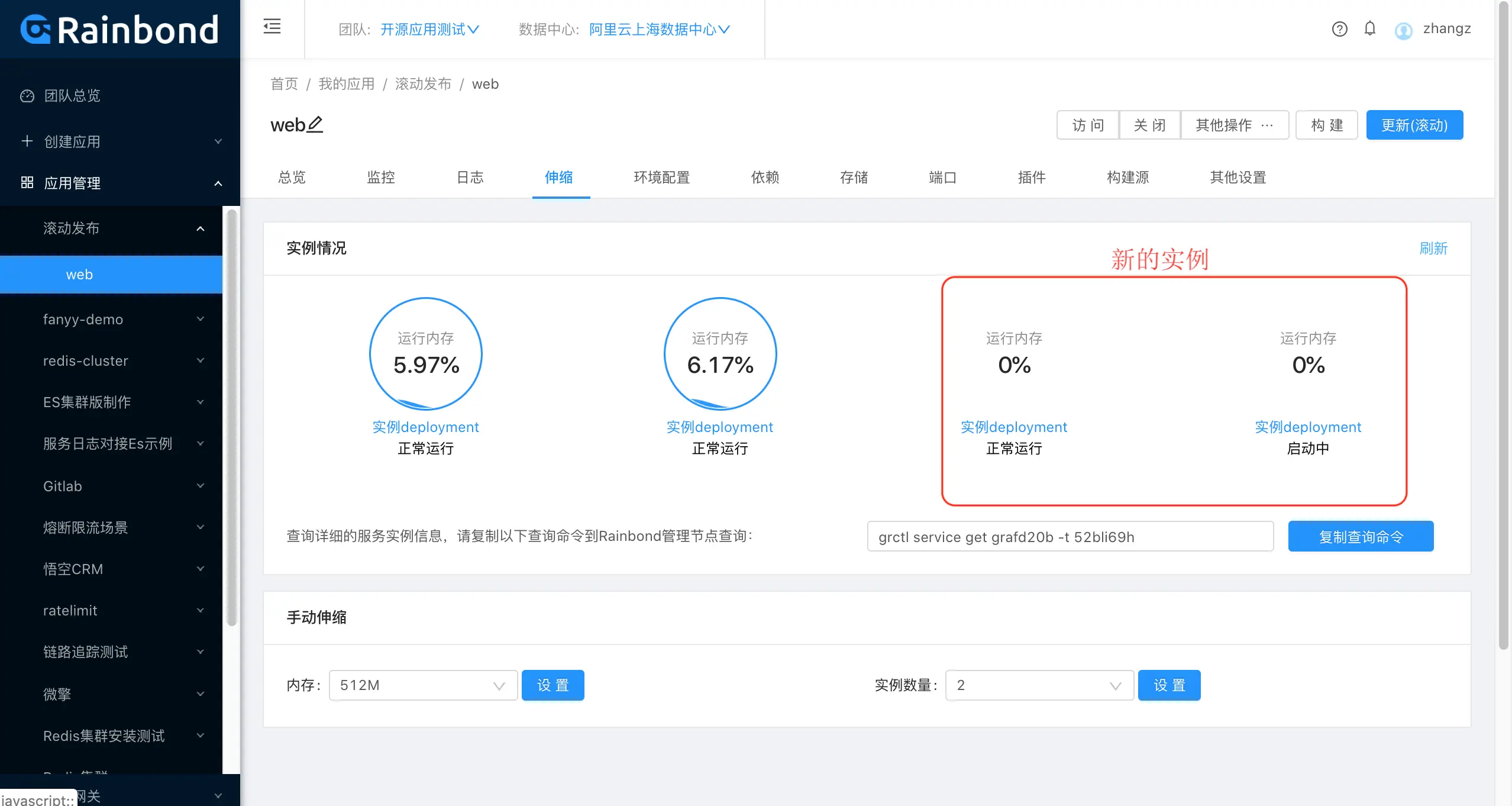 - 此时就会产生两个新的实例,查看新的实例是否被创建,若新实例内应用运行正常,旧的实例将会被废除,新的版本上线完成