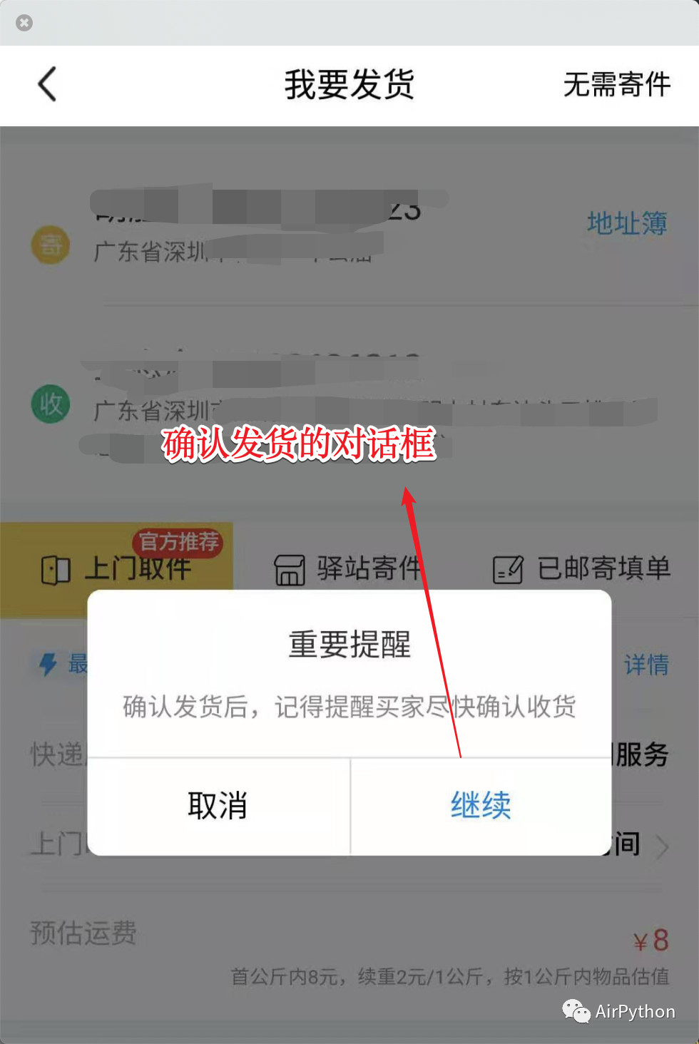 //发货界面 Activitypublic static String class_name_deliver = "com.taobao.idlefish.webview.WebHybridActivity";/*** * 判断是否是发货界面 */public static boolean judgeIsDeliverPage(AccessibilityNodeInfo node){ boolean result = false; List<AccessibilityNodeInfo> center_node = node.findAccessibilityNodeInfosByViewId(Ids.id_center_title); List<AccessibilityNodeInfo> right_node = node.findAccessibilityNodeInfosByViewId(Ids.id_right_up); if (center_node != null && right_node != null && center_node.size() > 0 && right_node.size() > 0 && center_node.get(0).getText().equals("我要发货") && right_node.get(0).getText().equals("无需寄件") ) { result = true; } return result;}/*** * 发货界面处理 * @param event */private void handleDeliverMet(AccessibilityEvent event){ AccessibilityNodeInfo rightNode = findViewByIDAndText(Ids.id_right_up, "无需寄件"); performViewClick(rightNode);}通过上面的操作,会弹出一个用于确认发货的对话框。