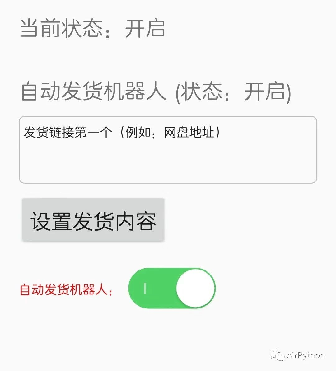 我已经将全部源码上传到公众号后台上,关注公众号「AirPython」后回复「 发货机器人 」即可获得下载链接。