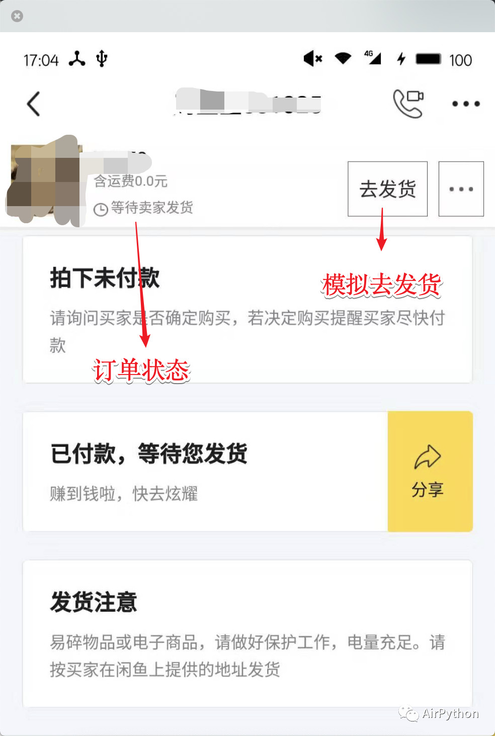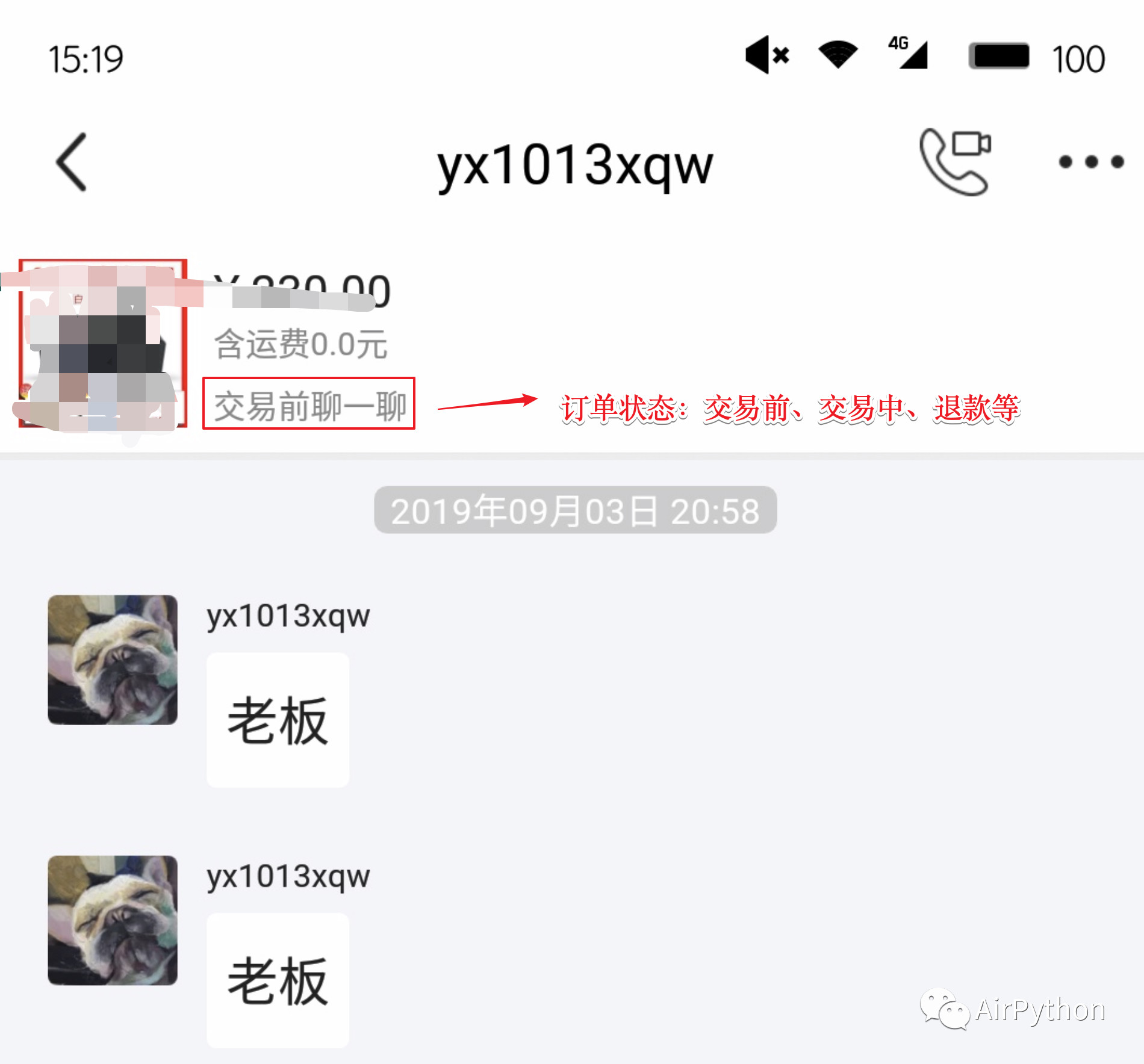 闲鱼中一个商品的订单状态包含:交易前、等待买家付款、等待卖家发货、退款等多种状态。