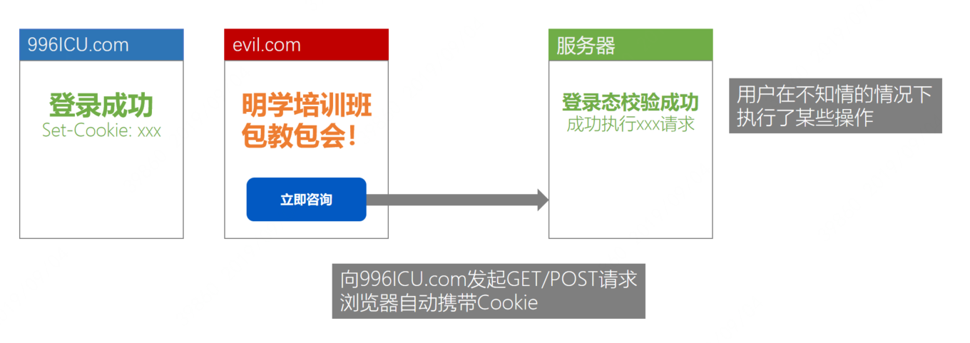 利用受害者在被攻击网站已经获取的登录态,冒充用户对被攻击的网站执行某项操作