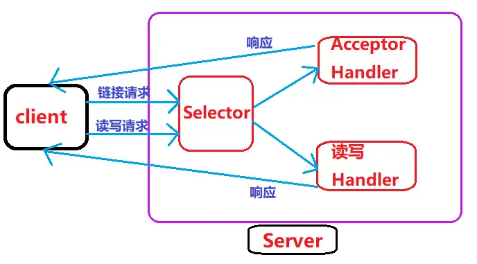 这就NIO,他的优点从上面的图也可以看出来。我们可能只需要创建一个Thread就可以处理所有的client了。当然每一个client要做的事情不一样,有的是连接请求,有的是读写请求,这时候server就可以根据不同的请求使用不同的handler了。再给出一张图看一下: