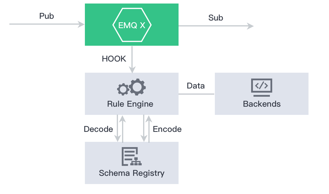 使用 Schema Registry 结合规则引擎功能,在规则引擎中直接通过 decode、encode 函数调用创建好的编解码规则,这一过程极大的简化消息应用的集成能力。