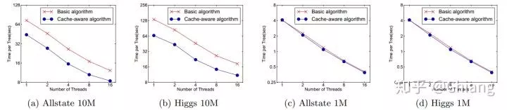 因此,对于exact greedy算法中, 使用缓存预取。具体来说,对每个线程分配一个连续的buffer,读取梯度信息并存入Buffer中(这样就实现了非连续到连续的转化),然后再统计梯度信息。该方式在训练样本数大的时候特别有用,见下图:
