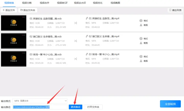 3、添加好视频后把左下角的输出路径调整好,调整的时候可以在输出路径的输入框直接写入或粘贴路径。