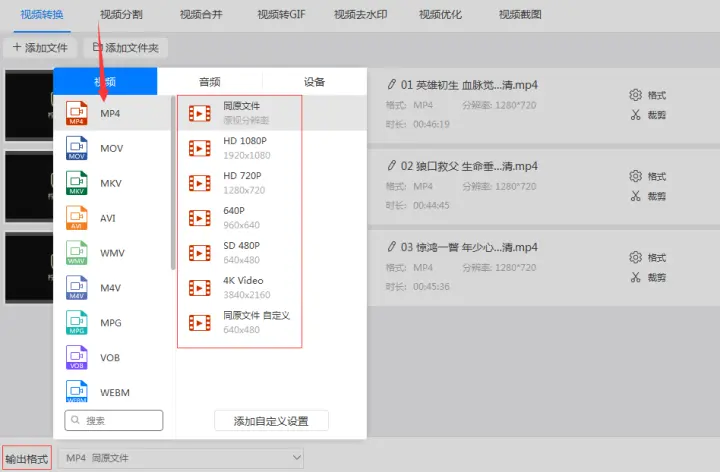 4、设置好输出路径后接下来就要把输出格式中输出的视频格式设置为mp4格式,同时还可以根据需要设置输出的分辨率。