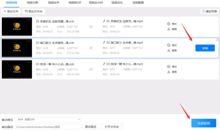 5、最后点击转换按钮就可以依次的把vob格式的视频根据你预设好的参数进行转换了。