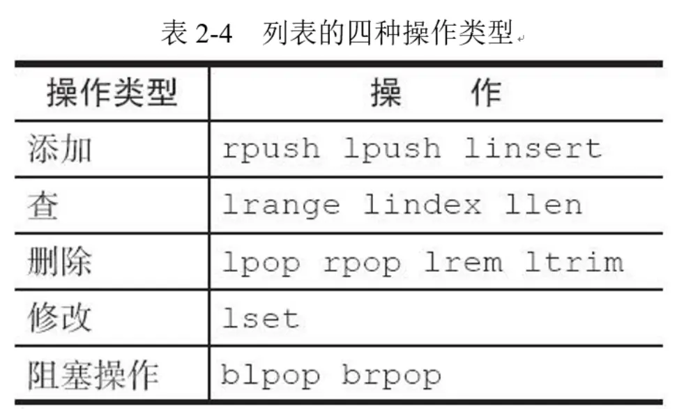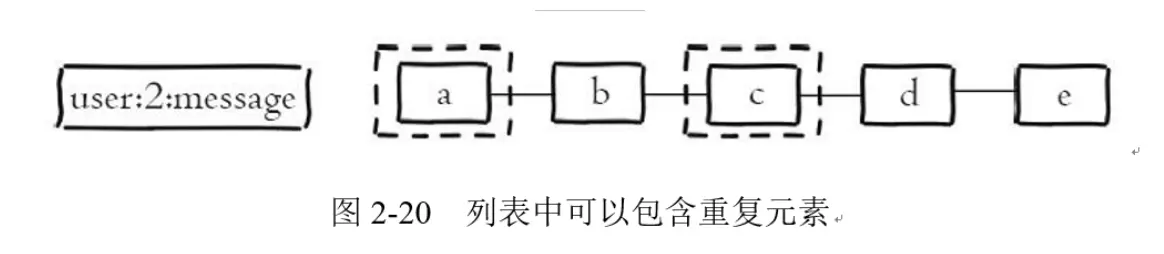 子列表获取、删除等操作列表类型有两个特点:第一、列表中的元素是有序的,这就意味着可以通过索引下标获取某个元素或者某个范围内的元素列表,例如要获取图2-19 的第5个元素,可以执行lindex user:1:message4(索引从0算起)就可以得到元素e。第二、列表中的元素可以是重复的,例如图2-20所示列表中包含了两个字符串a。