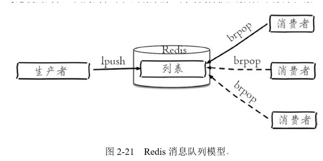 如图2-21所示,Redis的lpush+brpop命令组合即可实现阻塞队列,生产者客户端使用lrpush从列表左插入元素,多个消费者客户端使用brpop命令阻塞式的“抢”列表尾部的元素,多个客户端保证了消费的负载均衡和高可用性。