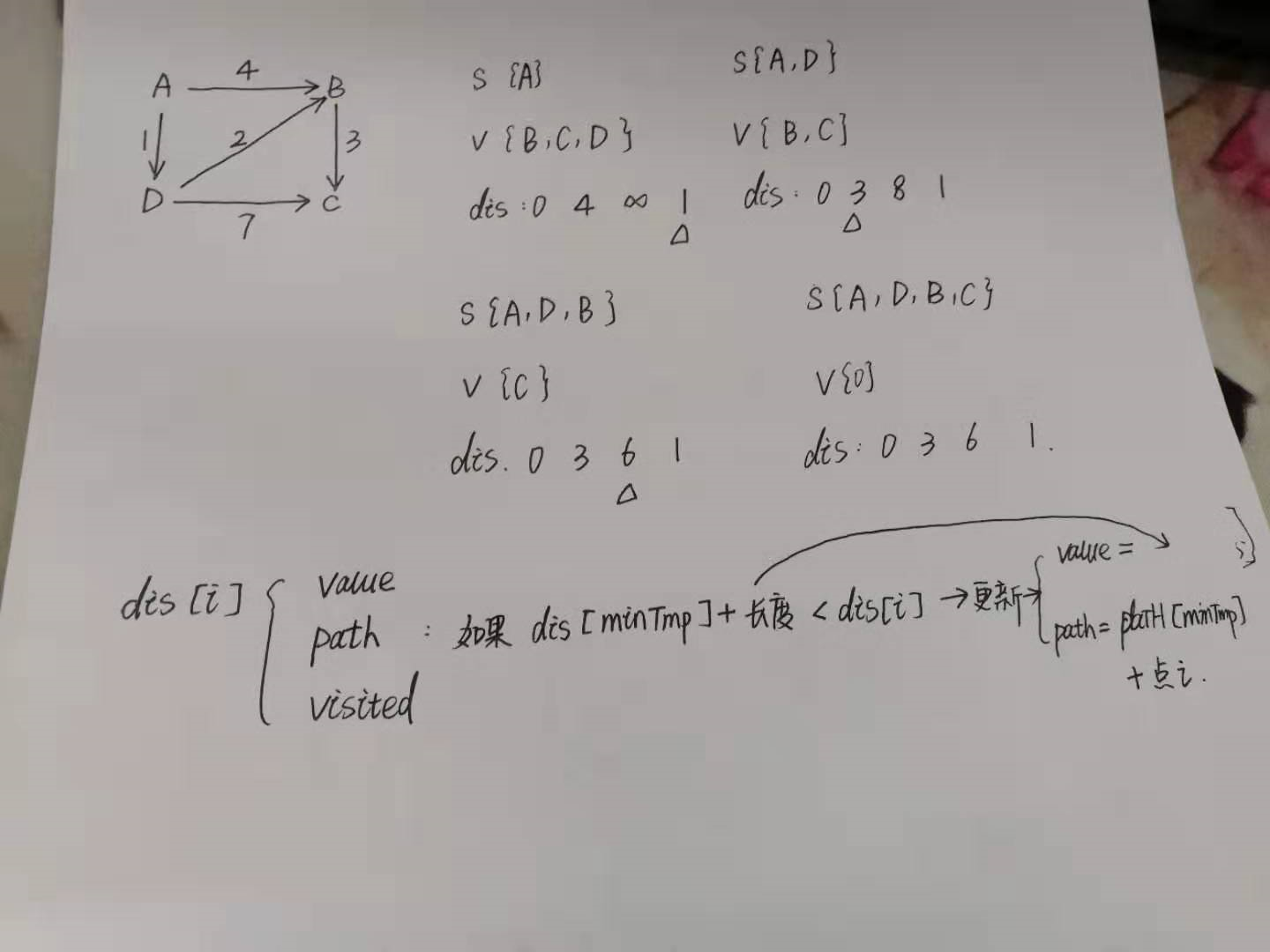 找到dis矩阵中未被添加到set中的点的最小值。并将该点加入set中,然后需要考察通过新添加的点到达其余点的路径和原路径哪个更短,如果新路径更短,需要更新dis数组的值。然后再找到dis矩阵中未被添加到set中的点的最小值,重复上述操作,直到set中包含了图中的所有点。