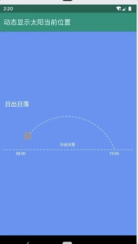 var sunriseTime = "08:00" var sunsetTime = "19:00" val dateFormat = SimpleDateFormat("HH:mm", Locale.CHINA) val nowDate = Date(System.currentTimeMillis()) val nowTime = dateFormat.format(nowDate) sunriseSunset.setTime(sunriseTime, sunsetTime, nowTime) sunriseSunset.startAnimation()