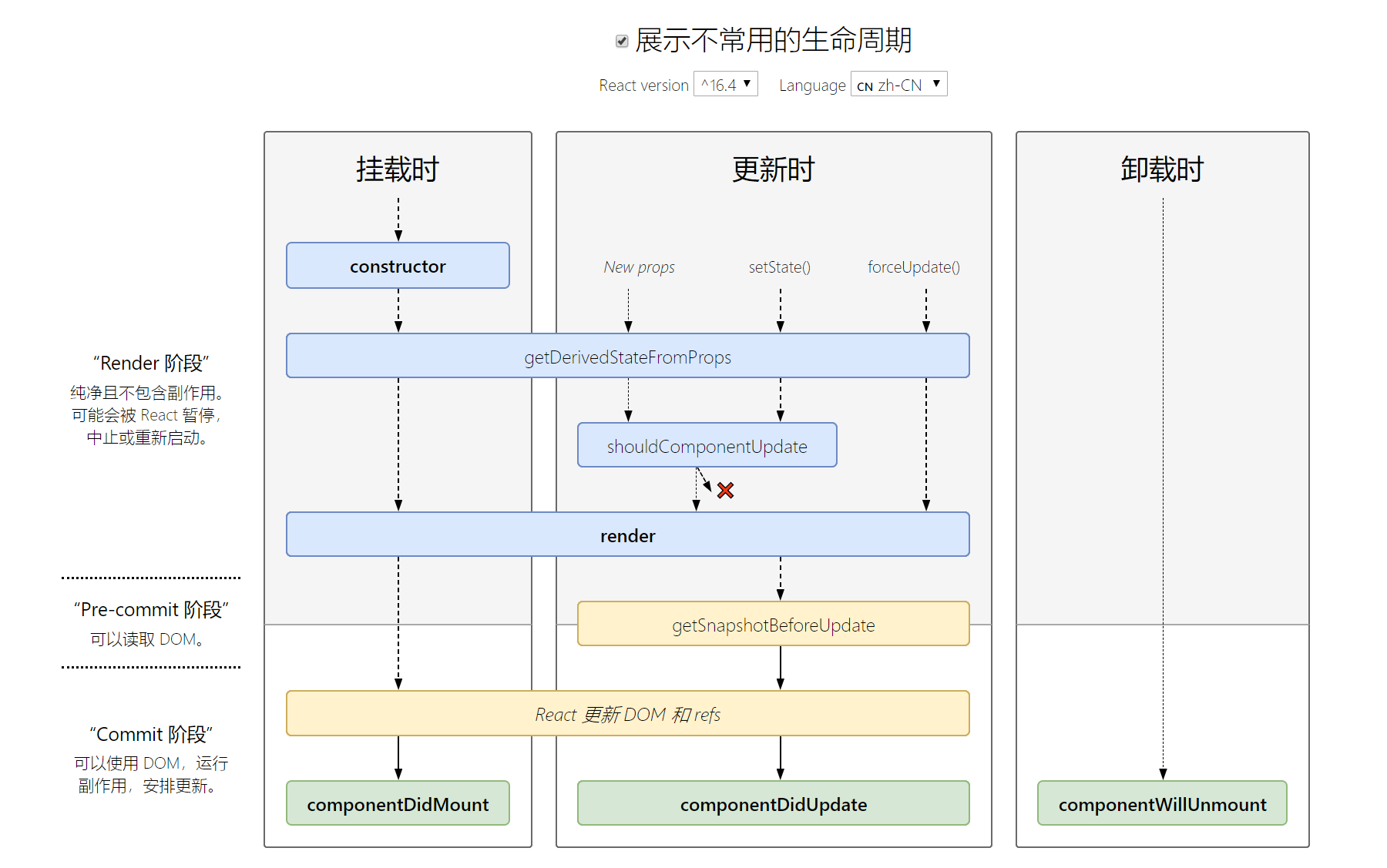 componentWillUnmount() 会在组件卸载及销毁之前直接调用。在此方法中执行必要的清理操作,